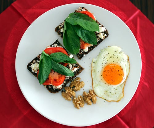 1 domates, nane, ezine peyniri, bir ufak kase kadar kinoa, 2 ceviz ve yumurta