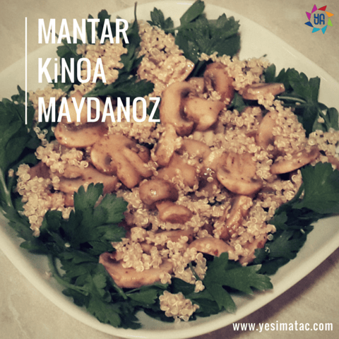 Maydanozlar iyice yıkanır, çok ufak olmayacak şekilde doğranır ve tabağın en altına yerleştirilir. Kinoa haşlanıp hazırlanır. Mantarlar ufak ufak doğranır, tavada zeytinyağında çevrilir. Mantarlar bir süre sonra baya su bırakacaktır. Su süzülür, tavaya balsamik sirke, karabiber ve kırmızı pul biber eklenir. Kısık ateşte biraz daha pişirilir. En son kinoa ve mantarlar maydanozların üzerine eklenir ve afiyetle yenir.