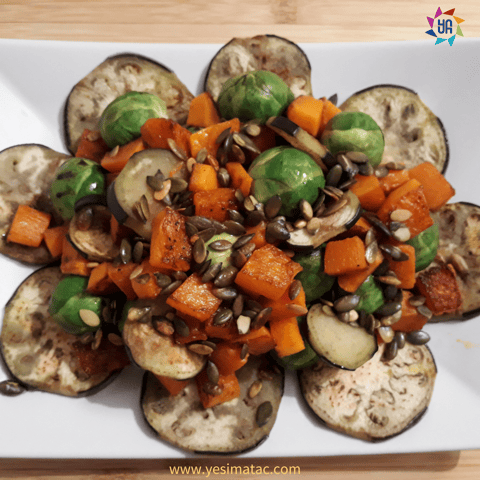 Brüksel lahanalarını iyice yıkayıp buharda pişirin. Patlıcanı ince ince doğrayın ve tavada hindistan cevizi yağında ızgara yapın. Daha sonra balkabağını kare kare doğrayın ve onu da hindistan cevizi yağında üzerine biraz zerdeçal, zencefil ve karabiber ekleyerek iyice yumuşayıncaya kadar ızgara yapın. Tüm sebzeleri büyük bir tabağa koyun ve son olarak tavada çiğ kabak çekirdeği içini de 2-3dk hafif kararana kadar kavurun, sebzelerin üzerine dökün ve birazcık da balsamik sirke ekleyin salatanız hazır.