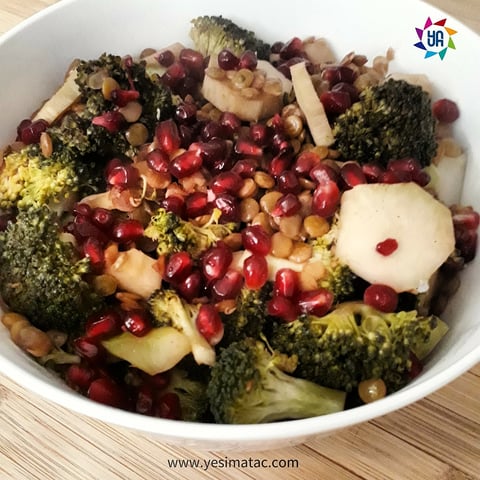 Brokolileri buharda pişirin. Mercimeği haşlayın. Hepsini bir kaseye koyun ve nar, zeytinyağı, balzamik sirke ve tuzu ekleyip karıştırın.