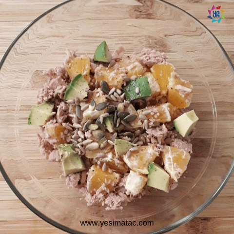 Avokado ve portakalı küp küp doğrayın, ton balığı, tuz, karabiber, zeytinyağını ekleyip karıştırın. Son olarak da üstüne kabak çekirdeği içini ekleyin.