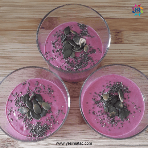 Pancar, yoğurt, bir tutam tuz ve karabiberi blenderdan parçacıklar kalmayacak şekilde geçirin. Karışımı küçük kaplara boşaltın ve üzerini dilediğiniz gibi süsleyin. Daha sonra minik kaplarınızı buzdolabına koyun. Yemeden önce bir kaç saat dolapta kalırsa benim daha çok hoşuma gidiyor fakat isterseniz yapar yapmaz da servis edebilirsiniz.